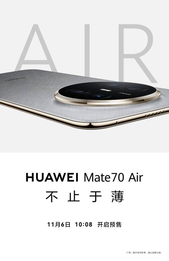 11月6日上午,华为终端官方微博发布了一则新品KV海报,轻薄大屏旗舰华为Mate 70 Air正式亮相,随后终端BG董事长余承东也分享了华为Mate 70 Air的创意视频,与此同时华为终端官方微博释出产品一张图,全面解锁新品核心卖点。最后,新品预售海报公布,华为Mate 70 Air正式开启预售。这款手机专为追求极致大屏体验的用户设计,不仅在轻薄手感与大屏体验之间找到了完美平衡,更在续航、影像、系统体验等方面实现了全面升级,一时间引发广泛关注与讨论。