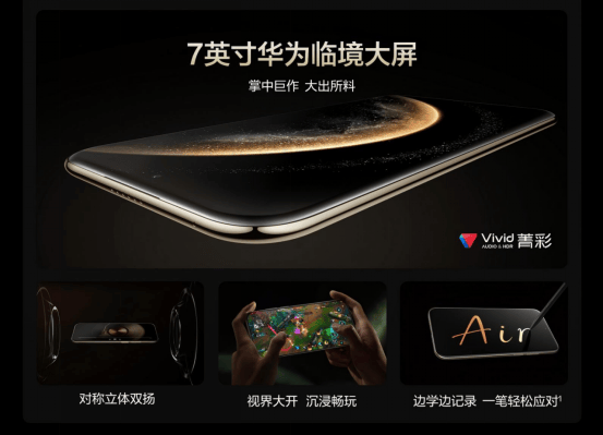 从华为官方释放的产品海报来看,华为Mate 70 Air在外观设计上延续了Mate家族的中轴对称与星环设计语言,经典气质与现代感并存。同时,整机208g的重量与6.6mm的厚度,配合81.5毫米的机身宽度,让用户在享受7英寸超大屏幕的同时,依旧轻盈便携,单手握持操作更为舒适。更让人惊喜的是,轻薄之下,华为通过引入全框VC配合台阶焊的散热架构,实现了散热效果和机身内部空间的极致利用。在6500mAh大容量电池与66W华为超级快充的支持下,用户无需在“轻薄”与“续航”之间做取舍,一整天的高频使用依然从容应对。